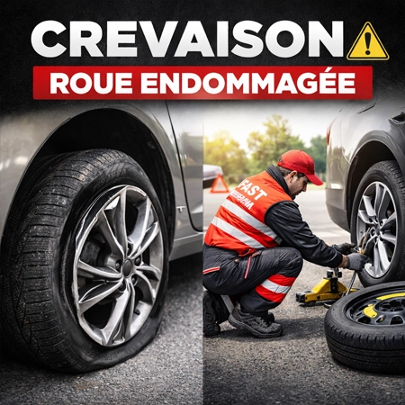 Un pneu crevé, une roue dégonflée ou une jante touchée peuvent immobiliser totalement le véhicule. Si la configuration le permet et si une roue de secours est disponible, une remise en route peut parfois être réalisée sur place. Lorsque ce n’est pas possible, le véhicule peut être remorqué vers un centre adapté.