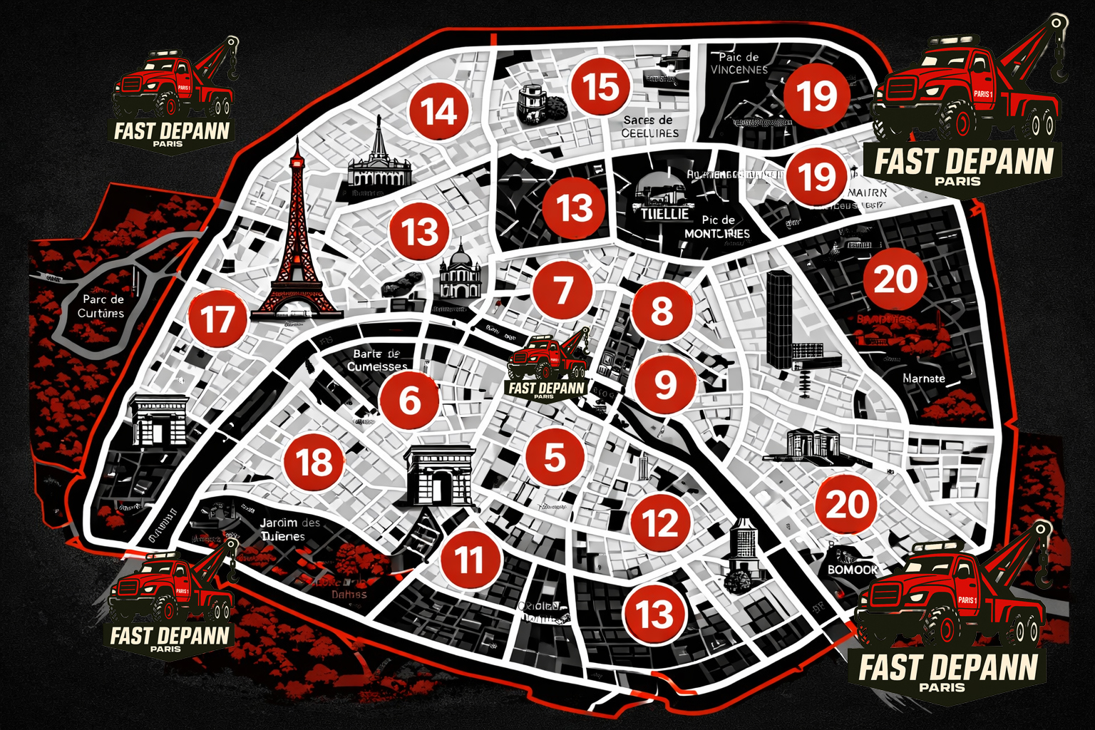 Le dépannage auto à Paris ne se limite pas à quelques quartiers centraux. Il concerne l’intégralité des vingt arrondissements, chacun présentant ses particularités. Le centre historique se caractérise par ses rues étroites et ses zones piétonnes, tandis que l’ouest parisien regroupe de larges avenues et des quartiers résidentiels plus calmes.